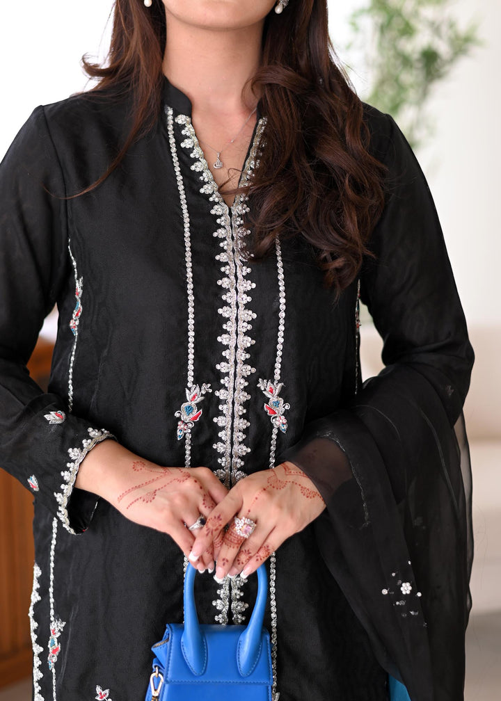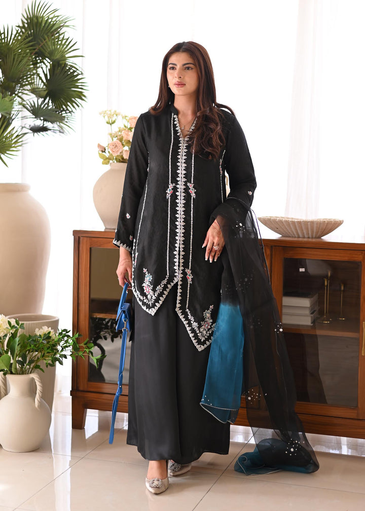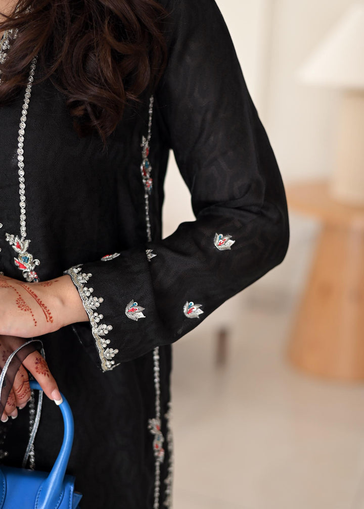 MISHAS timeless black ensemble crafted in self khaddi net, delicately hand-worked on the front and sleeves for an elegant finish. It is paired with flared silk pants that add graceful flow and style. The look is completed with a sheer organza dupatta adorned with sequin spray, giving it just the right hint of sparkle. Perfect for festive soirées, dinners, and formal gatherings where sophistication is key.